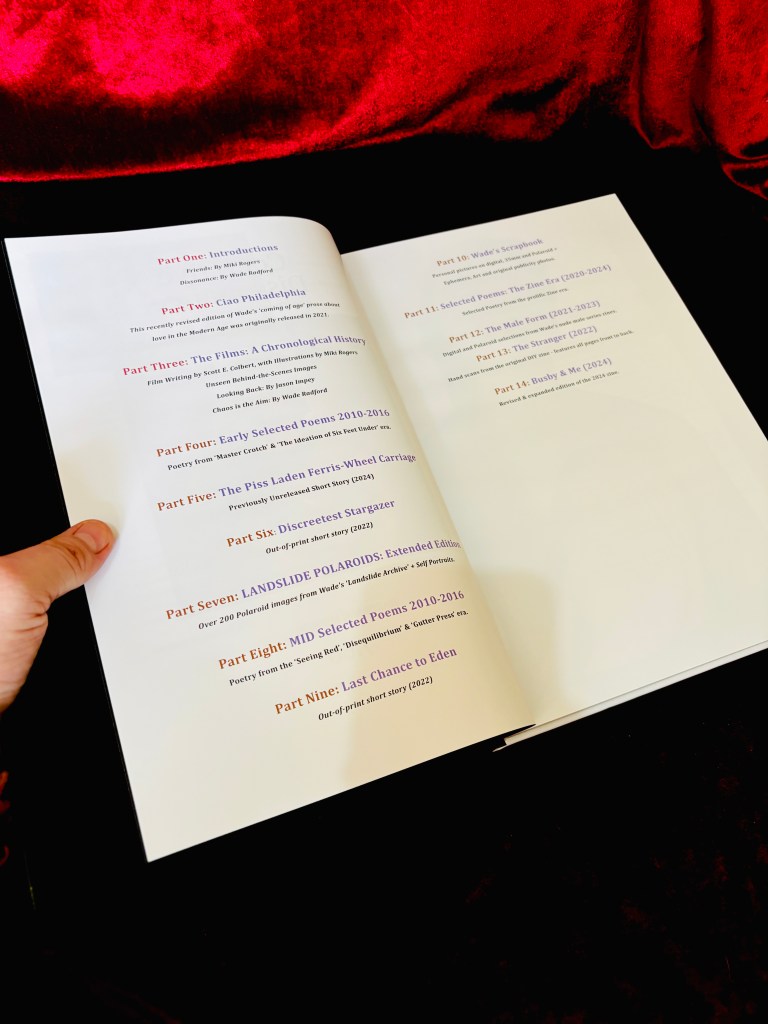 Nearly 700 Images/A Complete Film ‘Years’ Chronology, including new writing by Scott E.Colbert, Sketches by Miki Rogers, and new writings by Jason Impey & Wade Radford/Landslide: The Extended Edition of Polaroids/The Male Form/Scrapbooks/ Personal Pictures/The original hand made zine ‘The Stranger’ from original scans/The Extended edition of Busby & Me (2024)/Poetry Eras/ and more!
